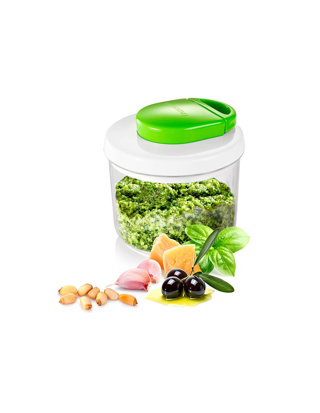 Mit einem Durchmesser von 14 cm und einer Höhe von 13,5 cm ist dieser Zerkleinerer kompakt und lässt sich in jeder Küche leicht verstauen. Dank des rotierenden Designs zerkleinern Sie Lebensmittel mit einer einfachen Drehung und sparen so Zeit und Mühe bei der Zubereitung Ihrer Lieblingsgerichte. Ob Zwiebeln, Knoblauch, frische Kräuter oder Nüsse – der praktische Rotationszerkleinerer ist ein vielseitiges Werkzeug, mit dem Sie bei Ihren hausgemachten Rezepten professionelle Ergebnisse erzielen. Seine robuste und langlebige Konstruktion sorgt für eine lange Lebensdauer und macht ihn zu einer sinnvollen Investition in Ihre Küche. Kurz gesagt: Der praktische Rotationszerkleinerer ist ein praktisches und funktionales Zubehör, das Ihre Kochaufgaben einfacher und effizienter macht. Mit scharfen Klingen und einem ergonomischen Design ist dieser Zerkleinerer perfekt für jeden Küchenliebhaber, der Qualität und Komfort in einem einzigen Produkt sucht.