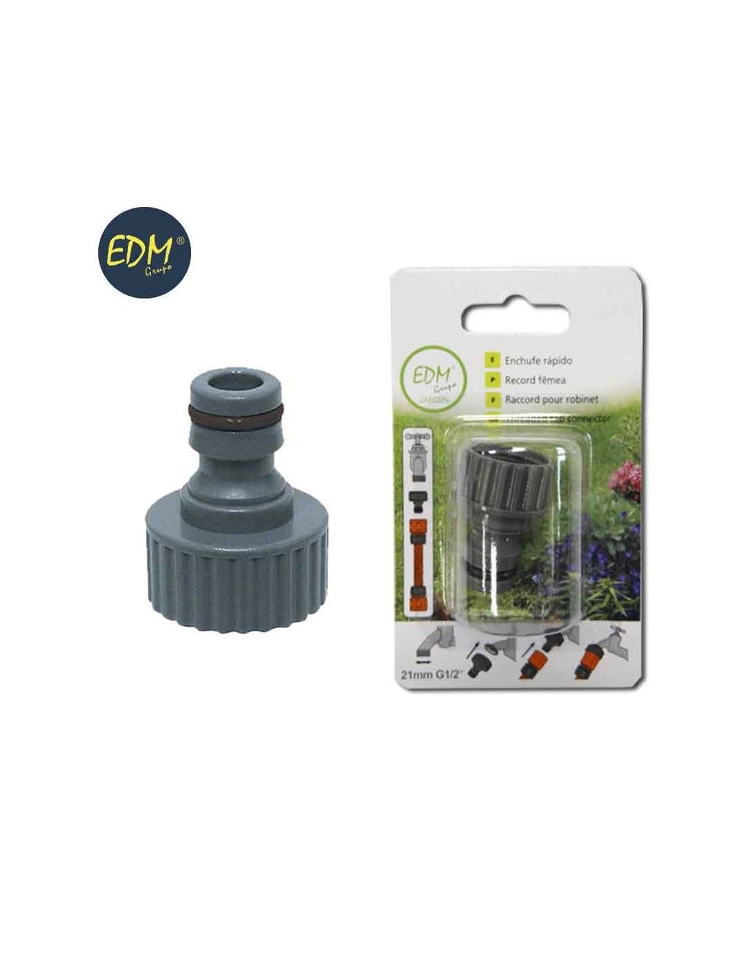 El Enchufe Rápido Rosca Hembra 1/2" de EDM es un accesorio de alta calidad diseñado para facilitar la conexión rápida de mangueras en sistemas de riego y jardinería. Fabricado en polipropileno de color gris, este enchufe cuenta con un tratamiento anti UV y anti algas para garantizar su durabilidad y resistencia a la intemperie.