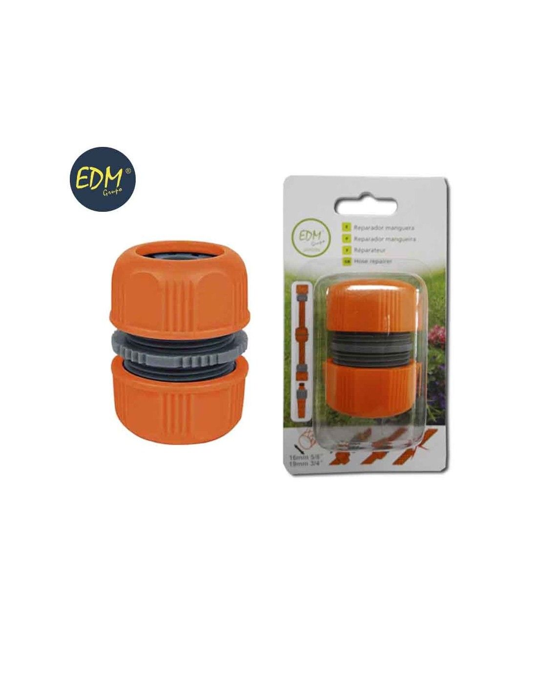 El Manguito de Empalme/Reparador de Manguera de Ø16 - 19 mm 3/4" - 5/8" de EDM es un accesorio esencial para reparar o unir mangueras de jardín de forma rápida y sencilla. Su diseño en color gris/naranja y fabricado en polipropileno garantiza resistencia y durabilidad. Además, cuenta con tratamiento anti UV y anti algas para una mayor protección y vida útil.