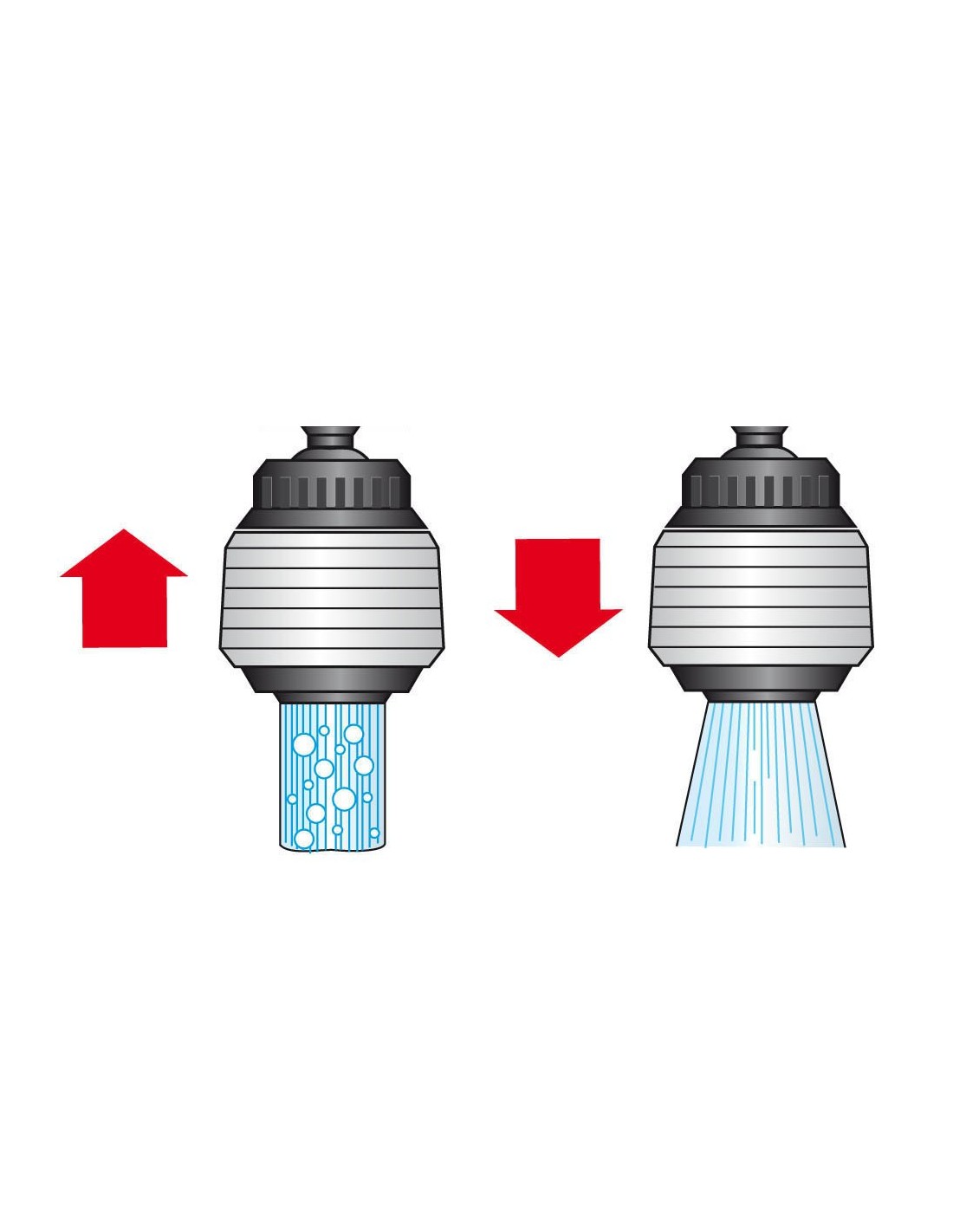 Atomizador aireador de la serie Blue Line, para grifo con cabezal orientable 360°. Ofrece dos modos de salida: chorro concentrado y modo ducha. Diseño ergonómico en color cromado y blanco, ideal para ahorro de agua y limpieza precisa en el fregadero.