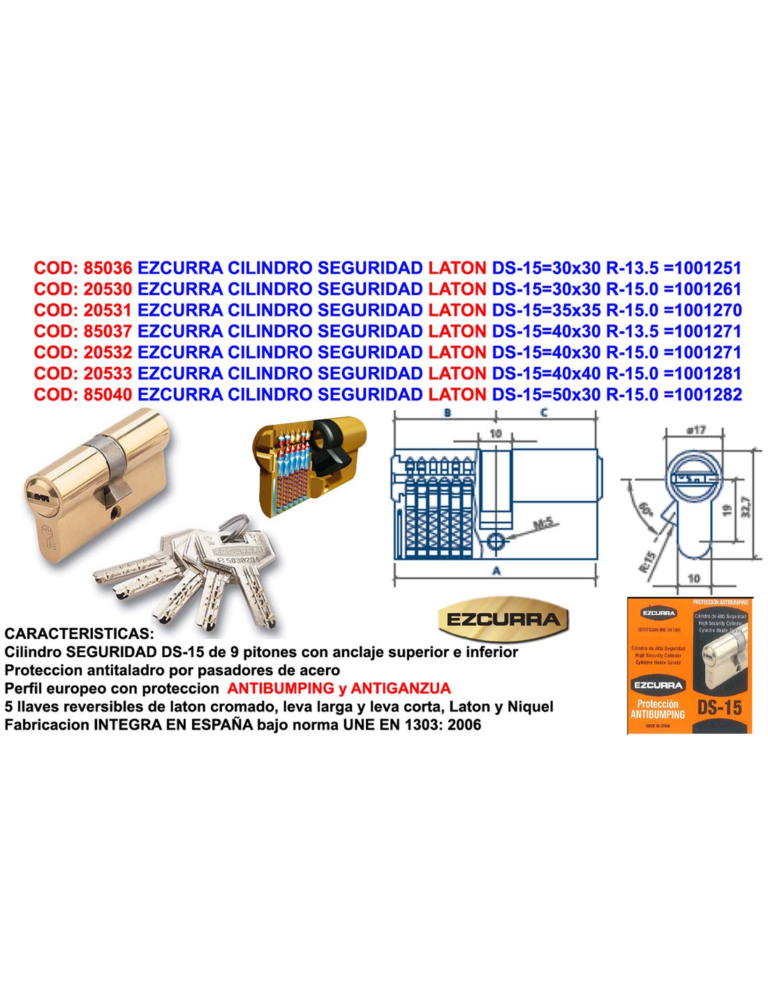 Cilindro de seguridad "R15" 35x35mm con sistema de 10 pistones fabricado en latón...