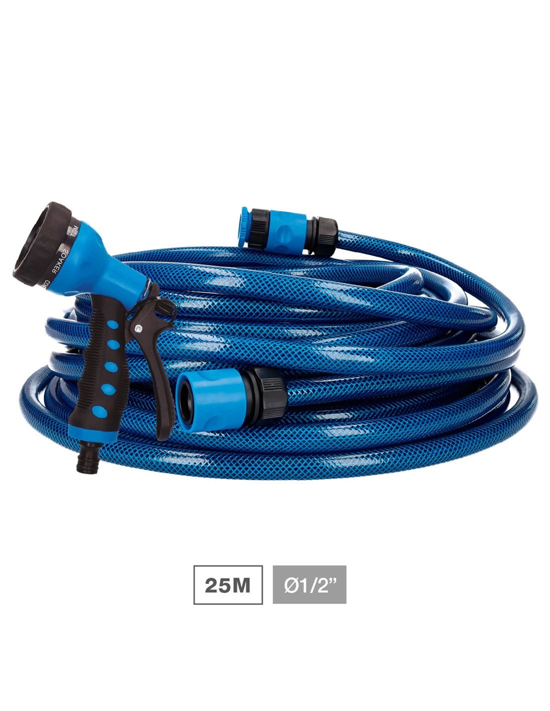 ¡Riega tu jardín con facilidad y eficiencia con el Kit de Manguera Hisua! Esta manguera de jardín de alta calidad, con un diámetro de 3/4" (19mm), te ofrece 25 metros de alcance para cubrir todas tus necesidades de riego.