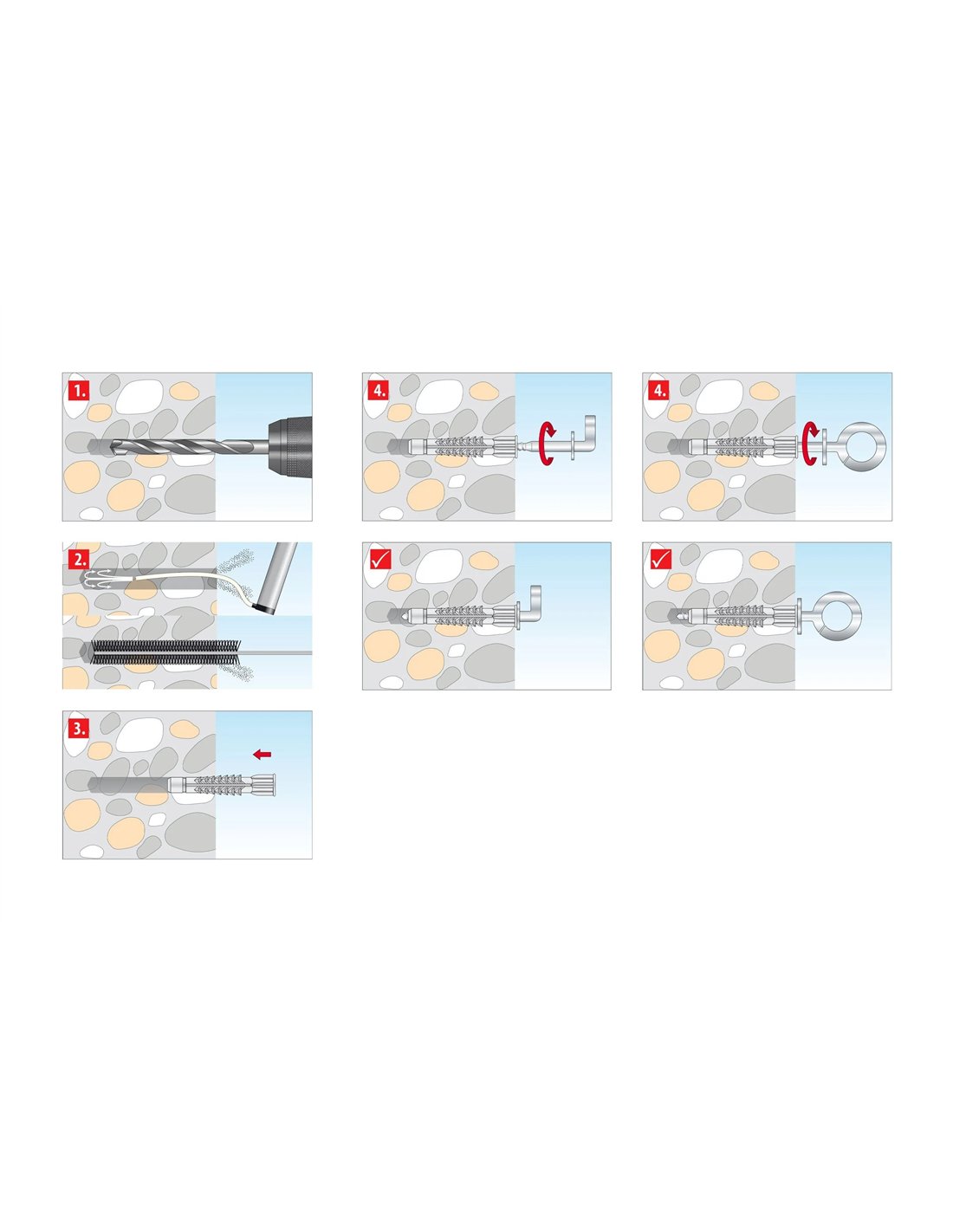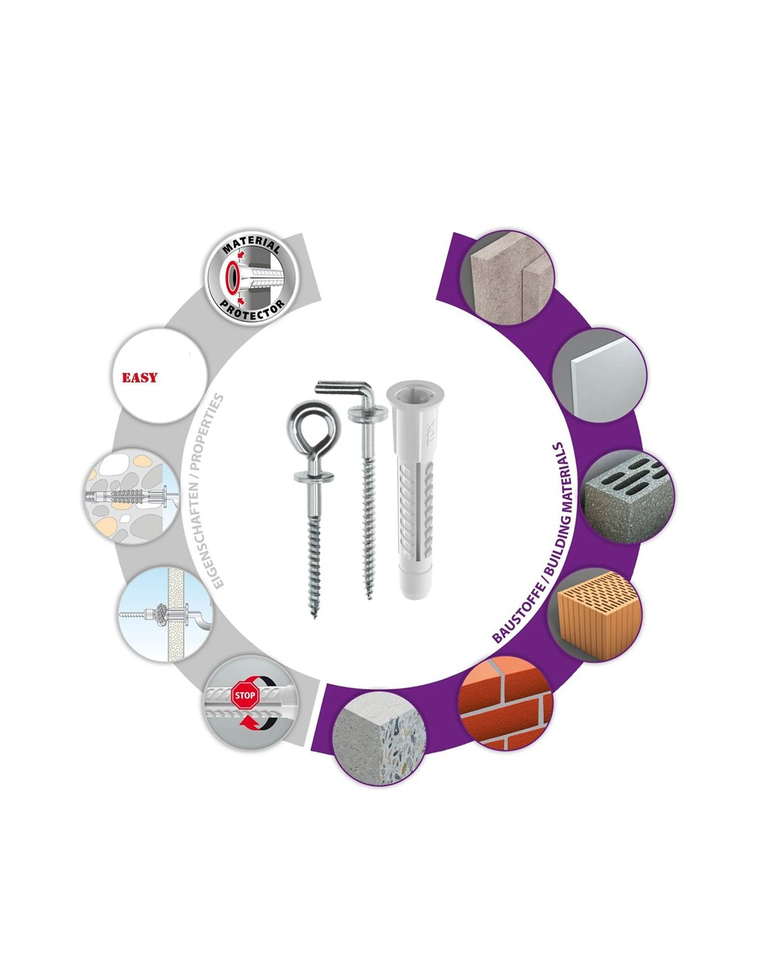 El taco cuenta con un dispositivo antirrotación que garantiza una sujeción firme y segura. La tapa del taco protege la superficie de instalación y evita que se deslice más profundamente en el orificio de perforación, lo que facilita su uso. Además, su collar se adapta automáticamente al material de construcción, proporcionando una sujeción fiable y cómoda.