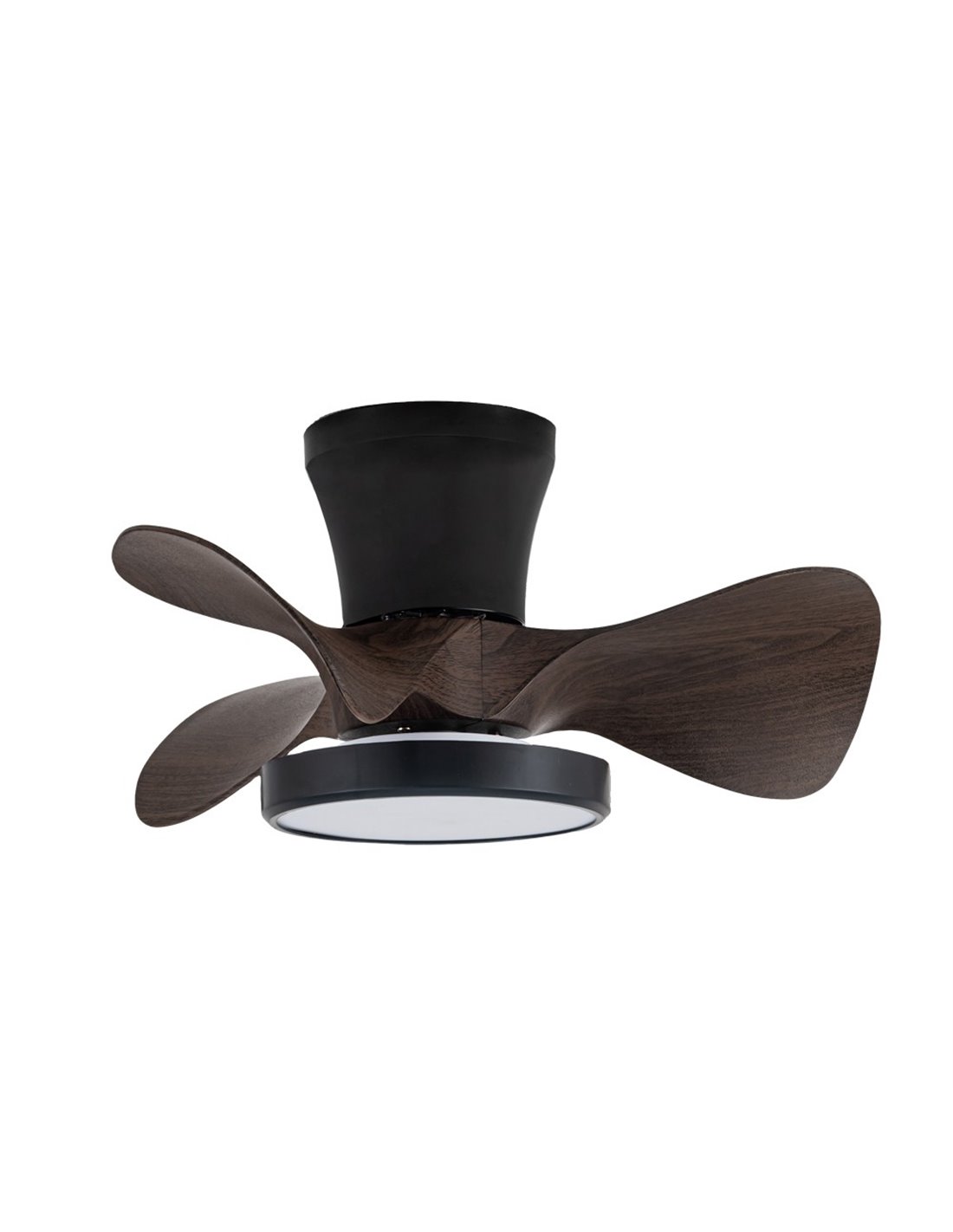 Ventilador de techo pequeño para dormitorios. Este ventilador silencioso con seis velocidades es ideal para estancias pequeñas (< 13m3). Fabricado en acero, con aspas de policarbonato y difusor de PMMA, su color negro con acabado en madera oscura lo hace perfecto para cualquier decoración. Puedes programar el apagado del ventilador y su iluminación LED integrada es regulable en intensidad y tono de color. Viene con mando a distancia incluido, y su potencia es de 20W con un flujo luminoso de 1900Lm. Además, tiene memoria de encendido, temporizador de 2-4 horas y un voltaje de 220-240V.