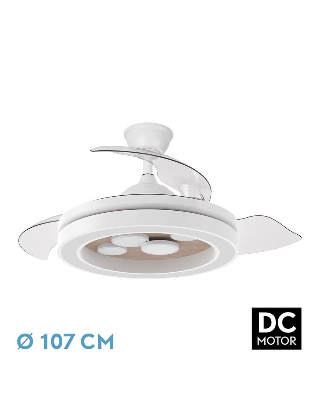 Ventilador DC de la serie CUPIDO realizado en metal, policarbonato y ABS, en color BLANCO/HAYA con tres aspas DESPLEGABLES de ABS transparente muy resistentes. Diseño muy moderno y original, con bonito juego de luces. Tiene seis velocidades ajustables. Tecnología LED integrada con una potencia de 55W, con 3 TEMPERATURAS SELECCIONABLES DE LUZ (3000-4500-6500K) y 4960 lúmenes. Control de aire verano o invierno. Su medida es de 32/47X50 centímetros con las aspas plegadas y de 32/47X107 centímetros con las aspas desplegadas. Incluye dos tijas de 10 y 25 centímetros, para colocar a distintas alturas. Mando a distancia INCLUIDO, REGULABLE EN INTENSIDAD, con MEMORIA DE COLOR incorporada y TEMPORIZADOR 2 H. Puede utilizar el control VIA APP : FAN LAMP PRO, desde el que podrá manejar también su ventilador de manera fácil e intuitiva desde su móvil. Modelo disponible en color blanco/haya y negro/madera.