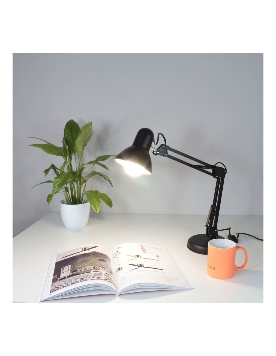 Lampe de bureau articulée en métal laqué noir à base ronde. Convient aux ampoules E27. La lampe a un câble de 110 cm et le corps et la tête peuvent être articulés, ce qui permet de diriger la lumière vers le point souhaité.