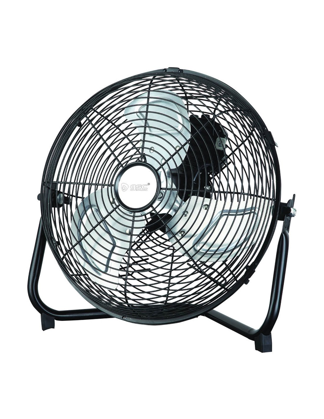 Ventilateur de sol en métal avec pales en métal et angle d'inclinaison réglable. Il a une grille de protection renforcée et fonctionne avec une puissance maximale de 70W.