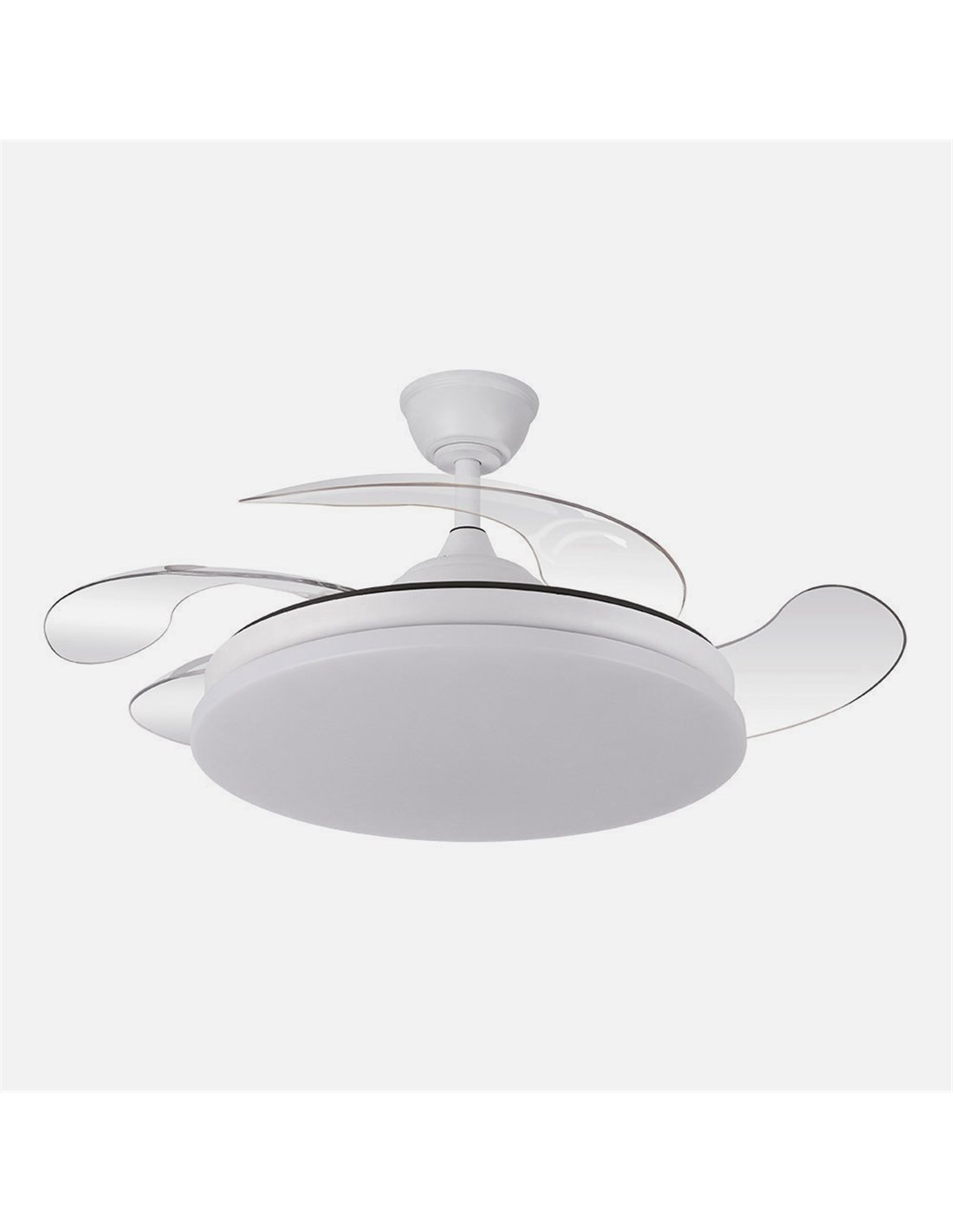 Ventilateur DC de la série TRIDENTE en métal, polycarbonate et ABS, de couleur BLANC avec quatre pales PLIABLES en ABS transparent très résistantes. Avec un design innovant, il est idéal pour compléter les décors modernes et classiques, servant à la fois de lampe et de ventilateur. Moteur à courant continu à six vitesses réglables. Technologie LED intégrée d'une puissance de 59W, 6980 lumens et 3 TEMPÉRATURES DE LUMIÈRE SÉLECTIONNABLES (3000-4000-6000K) lumière blanche chaude, naturelle et froide. Il est RÉGLABLE EN INTENSITÉ, avec télécommande INCLUSE avec MÉMOIRE DE COULEUR intégrée et MINUTERIE 2/4 H. Contrôle de l'air été ou hiver. Ses dimensions sont de 34,5/42X50 centimètres avec les lames pliées et de 34,5/42X107 centimètres avec les lames dépliées. Comprend deux tiges de selle, 12,5 et 20 centimètres, pour différentes hauteurs. Dans cette série, nous trouvons deux tailles de ventilateurs et dans les couleurs blanc, noir, nickel et cuir, afin que vous puissiez choisir celui que vous préférez et celui qui convient le mieux à votre décoration.