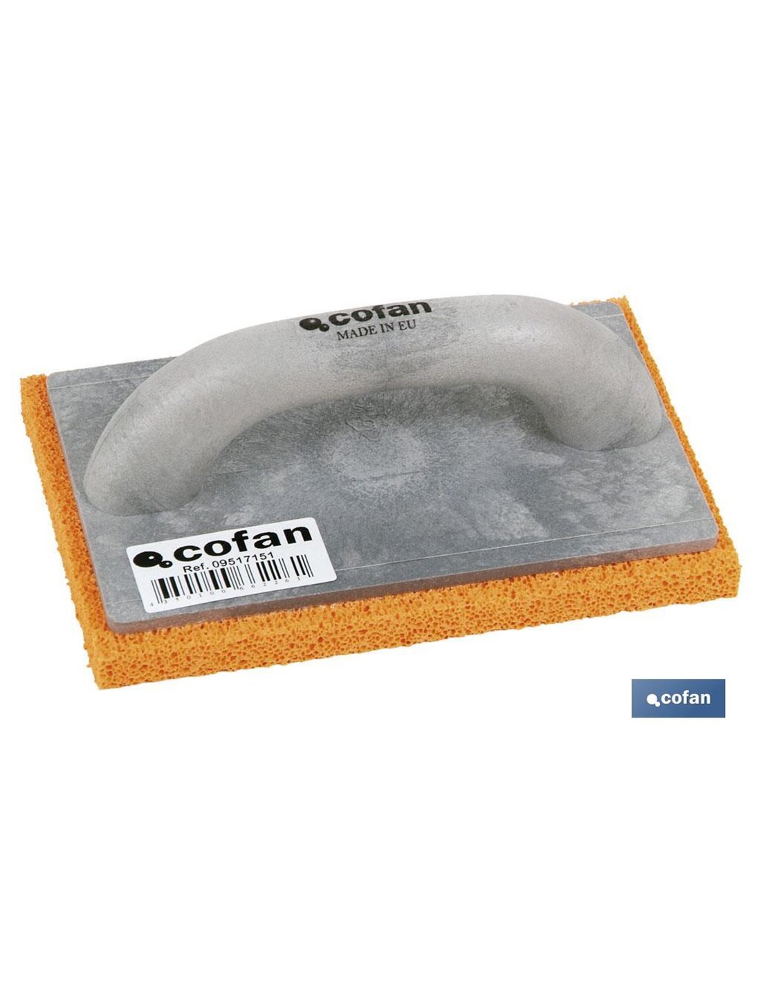 Fratás ou truelle avec éponge épaisse de couleur orange disponible en différentes tailles. Il possède un manche en fibre de verre, très confortable, léger, ergonomique et antidérapant. Il est utilisé pour les travaux de construction. C'est un outil de finition et est utilisé par les carreleurs en phase finale pour bien nettoyer les joints entre les carreaux. Il est très pratique et s'utilise d'une seule main. C'est un composant manuel nécessaire pour que les professionnels puissent exercer correctement leur métier.