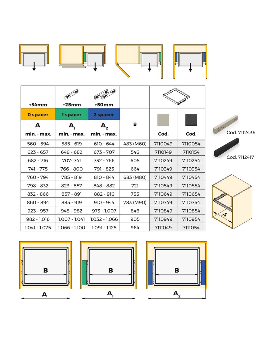 Vous pouvez d'abord installer l'entretoise pour l'armoire avec des vis Ø4x25mm puis joindre le guide avec des vis EURO Ø6,2x13mm. Ou vous pouvez pré-fixer l'entretoise au guide avec quelques clips qu'il comprend, puis fixer l'ensemble au meuble avec des vis Ø4x40mm. 1 entretoise latérale et 8 vis EURO Ø6,2x13mm sont fournies. Il est fabriqué en plastique avec une finition gris pierre ou noire, selon le modèle choisi.