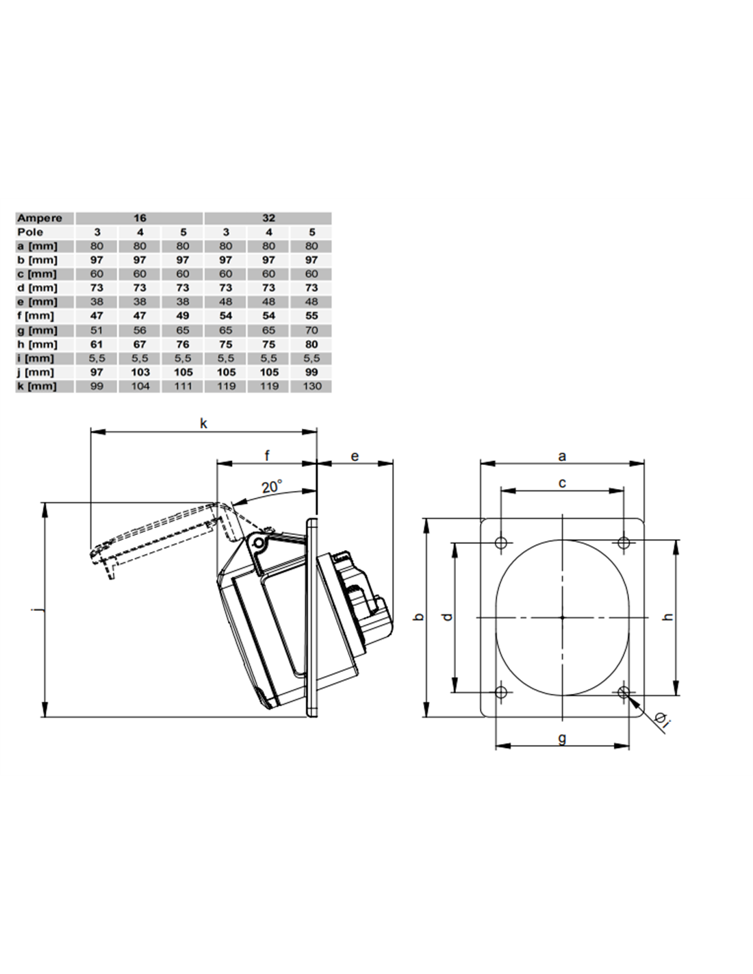 The 3P+T tilted industrial socket is a device designed to provide a safe and efficient electrical connection in industrial environments. With a capacity of 32A and a voltage of 400V, this socket is ideal for applications requiring high power. Its robust design and IP44/IK09 rating ensure adequate protection against water and solid object ingress, making it suitable for outdoor use and harsh conditions.