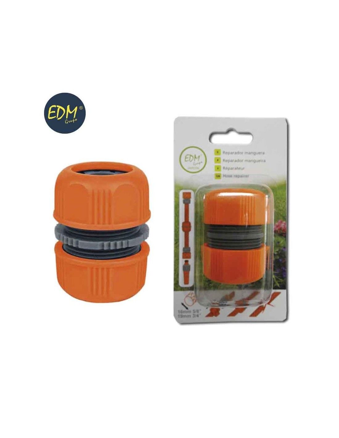 The Ø12 - 15 mm 1/2" - 5/8" Hose Splice/Repair Sleeve from the EDM brand is an essential accessory for repairing or joining garden hoses quickly and easily. Its gray/orange design makes it easy to identify, and its polypropylene material guarantees durability and resistance.