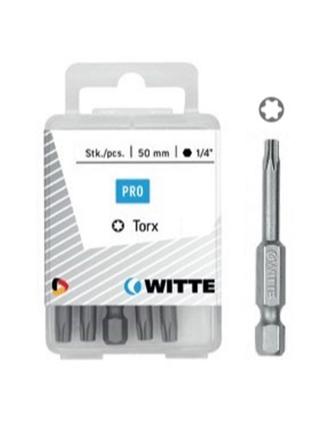 Witte-429618-5 bits are high-precision screwdriving tools designed to deliver exceptional performance on any project. Made from high-alloy steel, these bits undergo a post-hardening process that guarantees their durability and wear resistance. Thanks to the use of state-of-the-art technology and machinery, each bit features a precise geometry that optimizes torque transmission, ensuring a perfect fit on the screw head. The intrinsic quality of these bits, combined with proper application, determines their longevity and effectiveness in daily use.
