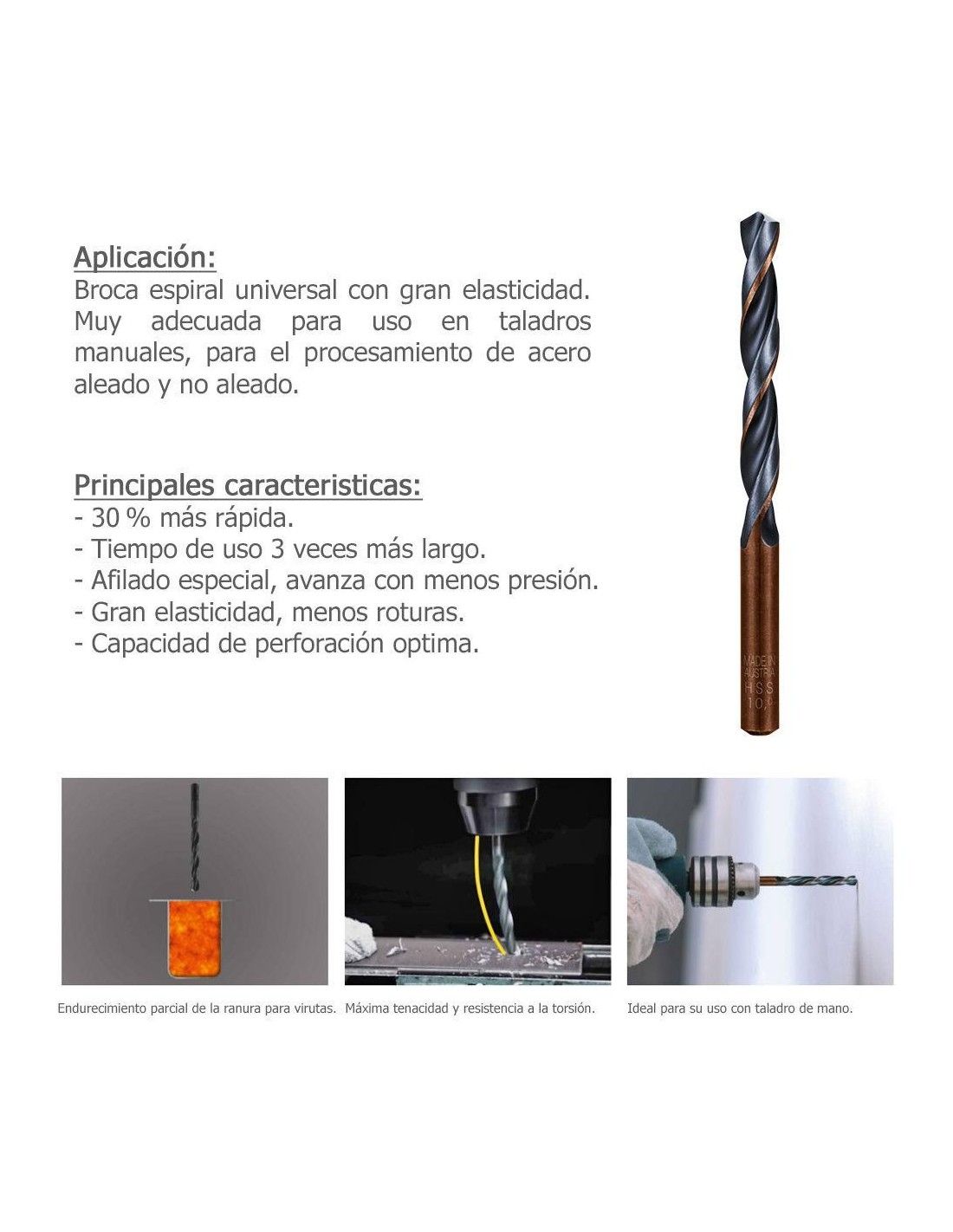 - Application: Universal spiral drill with great elasticity. Very suitable for use in manual drills, for processing alloy and non-alloy steel.