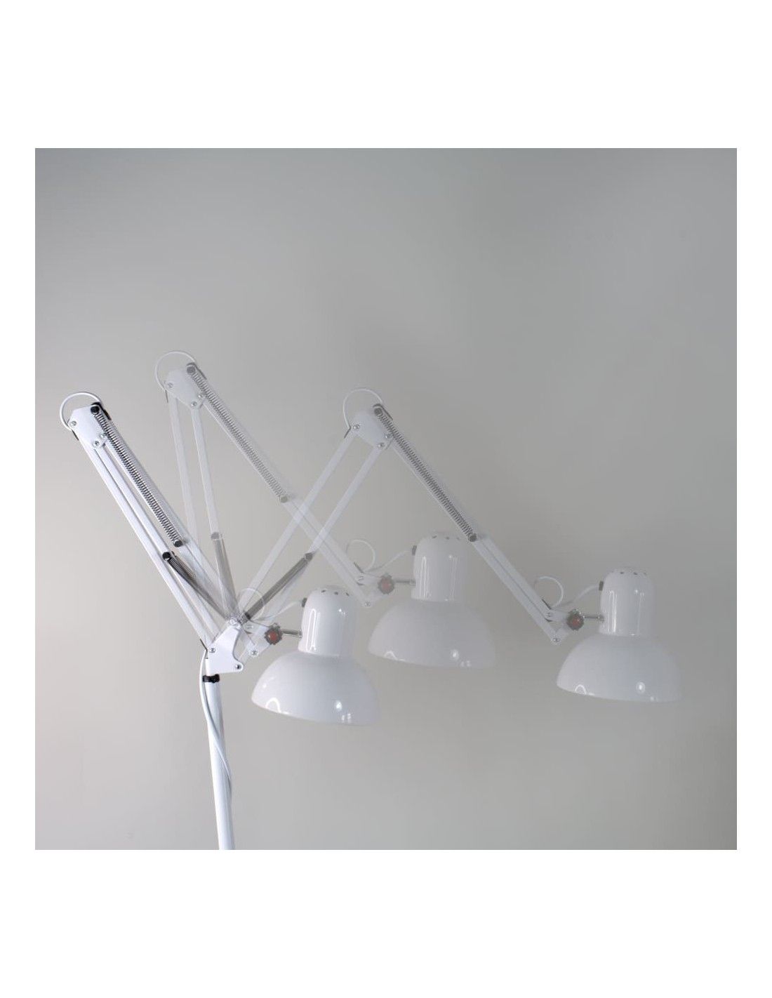 Classic-style articulated floor lamp in white lacquered metal with a round base and a height-adjustable body. Suitable for E27 bulbs. This floor lamp has a 240cm cable and a switch on the floor that allows you to turn on the lamp with your foot without having to bend down. Both the body and the head are articulated, allowing the light to be directed to the desired point, and the support is adjustable in height between 45 and 90cm.