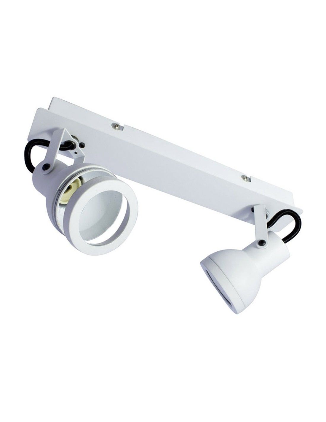 Ceiling bar with tilting iron spotlights in white lacquered finish. Fit for GU10 bulbs, not included. It can be installed on the ceiling or on the wall, allowing the light beam to be directed to a specific point thanks to its angle of inclination and rotation. Nice spotlight to install in living rooms, dining rooms and bedrooms.