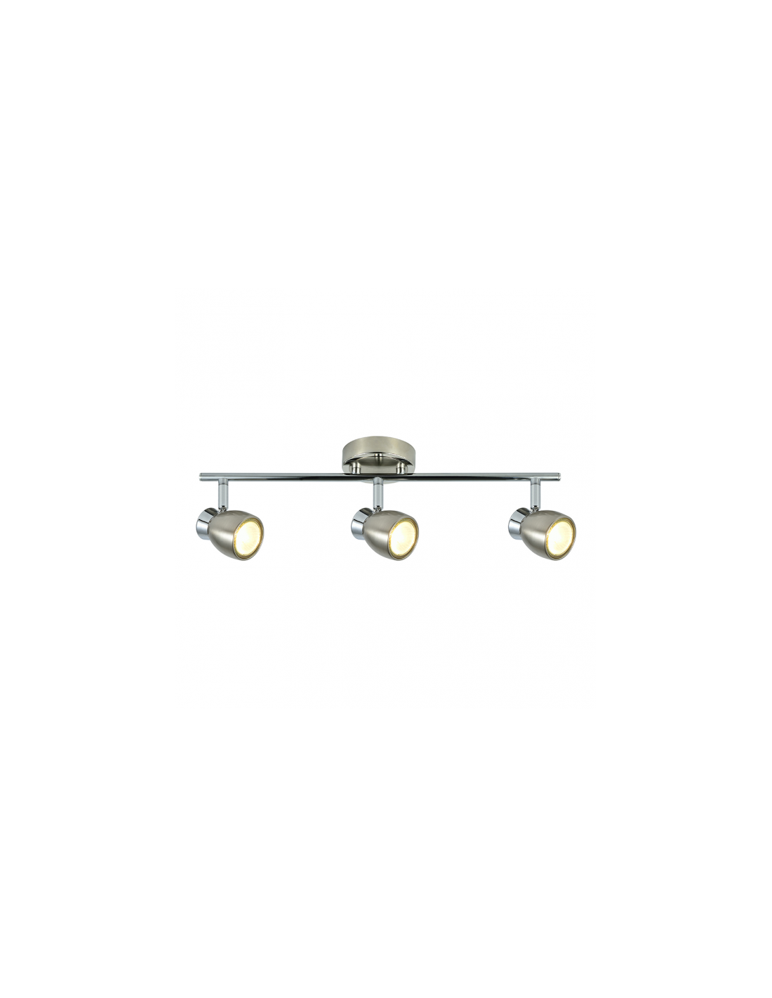 Strip with three spotlights from the CHACHO series in NICKEL/CHROME color. Made of metal with three GU10 lamp holders. Bulbs not included. With a modern and original design with vertically articulated spotlights and a horizontal rotation of almost 360º, thus allowing the light points to be directed to any area of ​​the room. Its dimensions are 14X48.5X10 centimeters. Model also available in leather and white/chrome. The collection can be completed with the four-light strip, two-light strip, three-light ceiling and one-light bulb version.