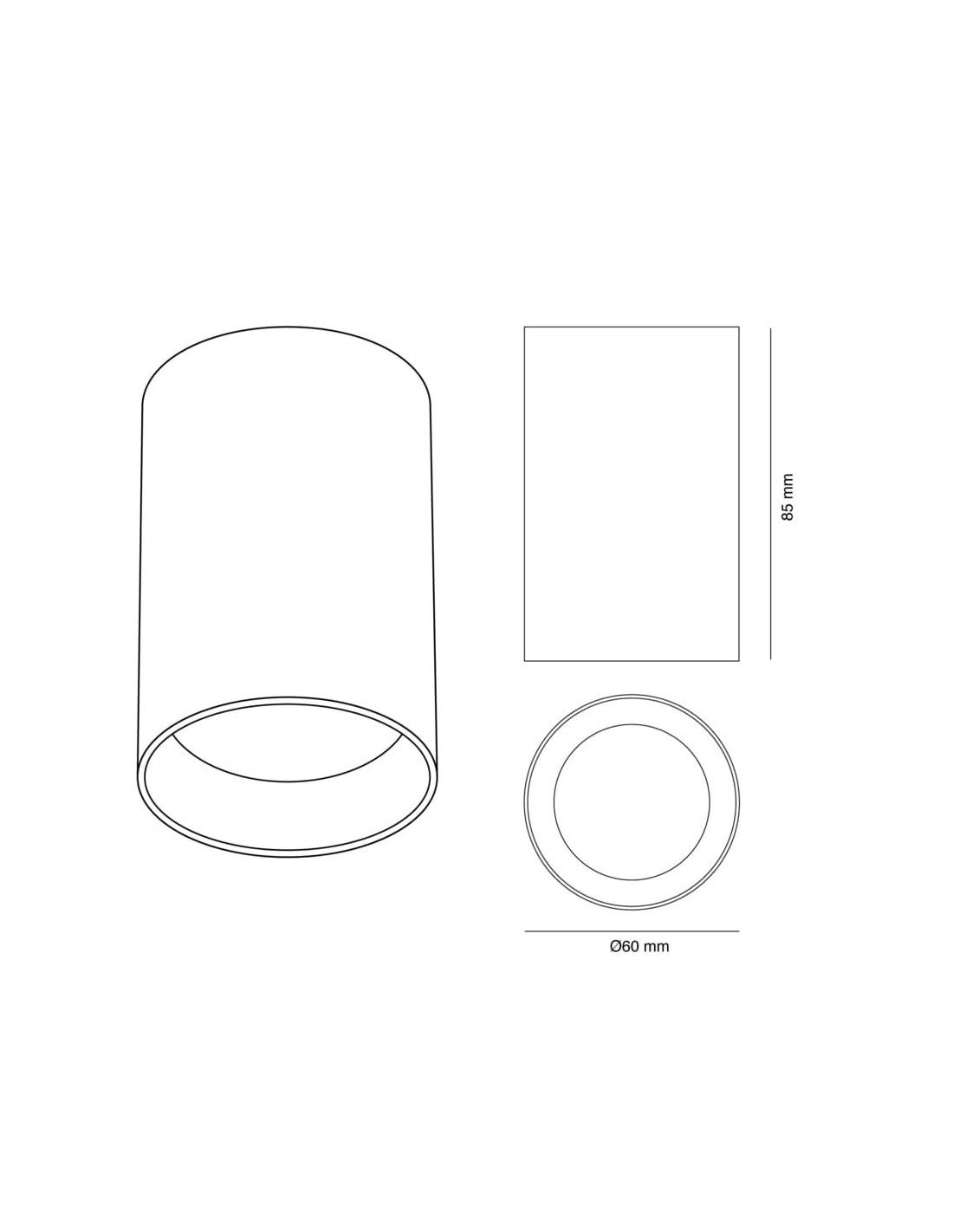 Cylindrical fixed ceiling spotlight for GU10 bulb, easy to install and replace the bulb without having to disassemble it. The spotlight is made of lacquered aluminum in a matte finish. Perfect for focusing lighting.