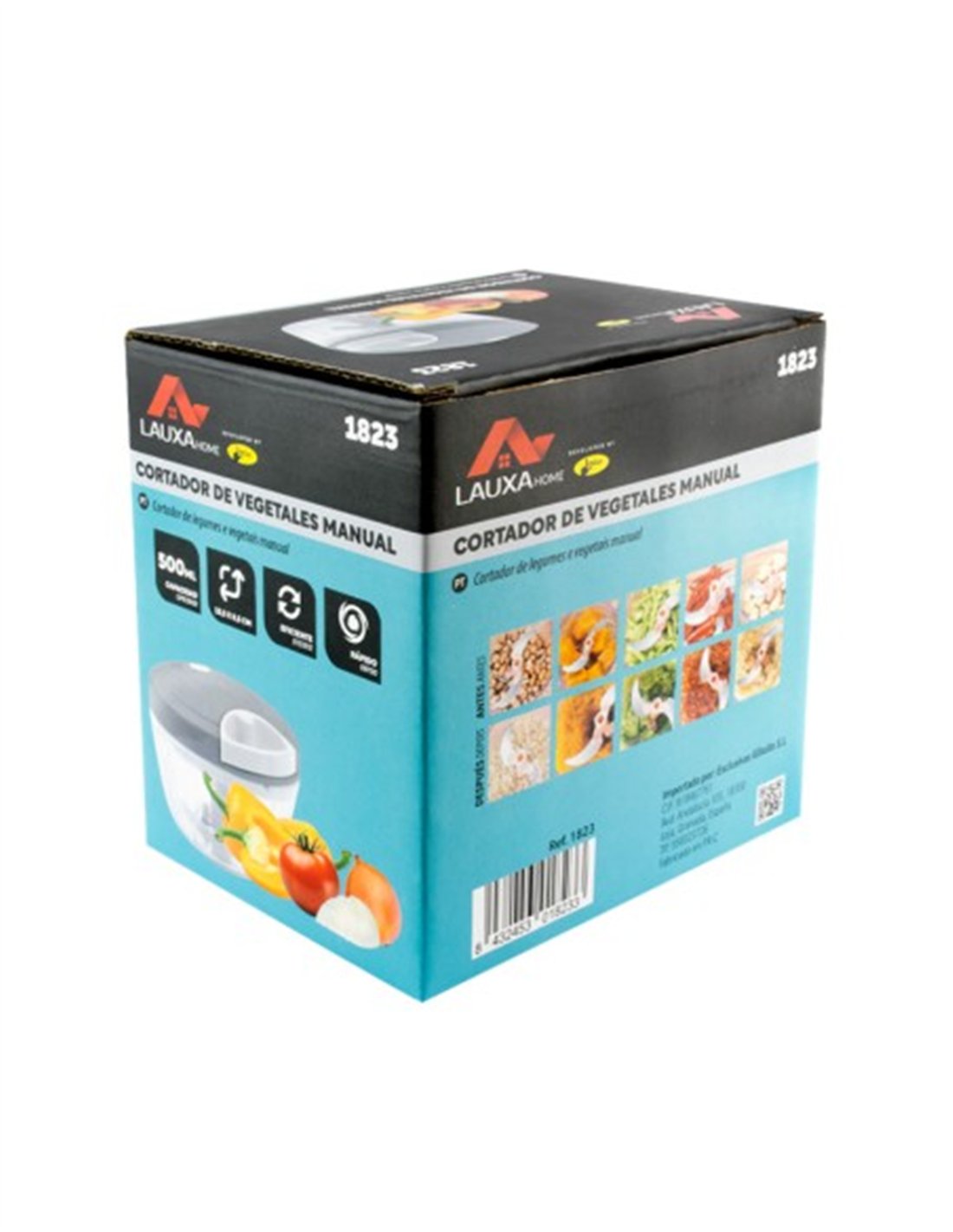 500ml vegetable slicer with a rotating feed system. Ideal for slicing fruits, vegetables, and nuts in seconds, with stainless steel blades that ensure a continuous cut. Packaged in a box, 12cm diameter.