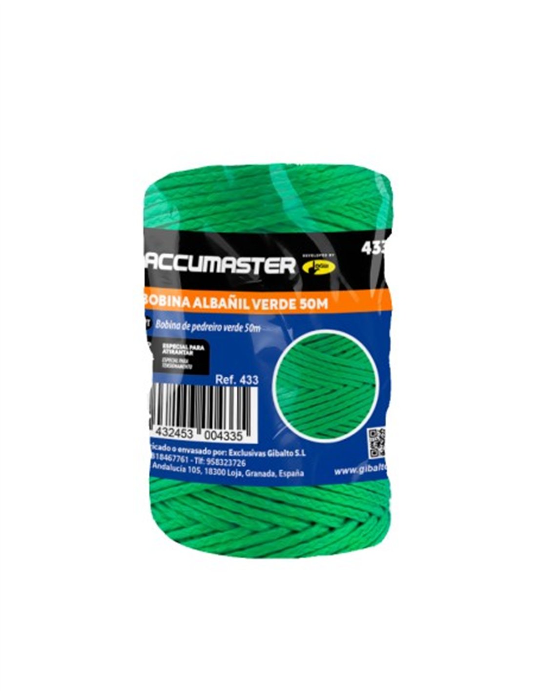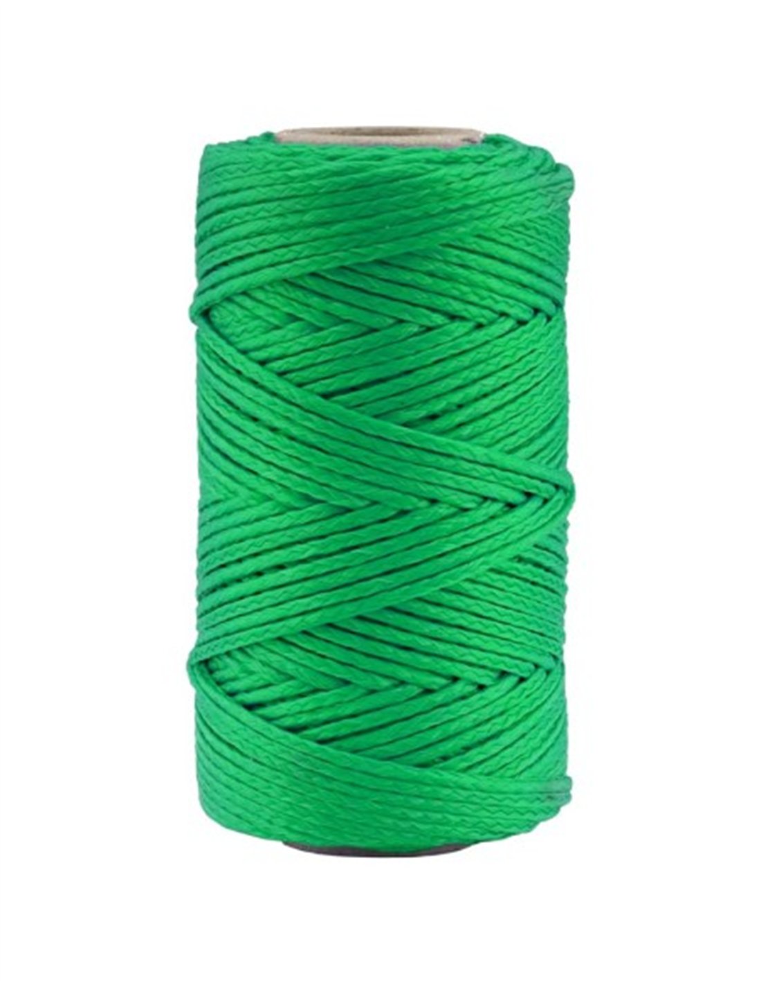 The 100-meter green masonry cord spool is a braided polypropylene cord designed for versatility and strength in a variety of applications. This product is characterized by its durability and softness to the touch, making it suitable for multiple uses in different environments.