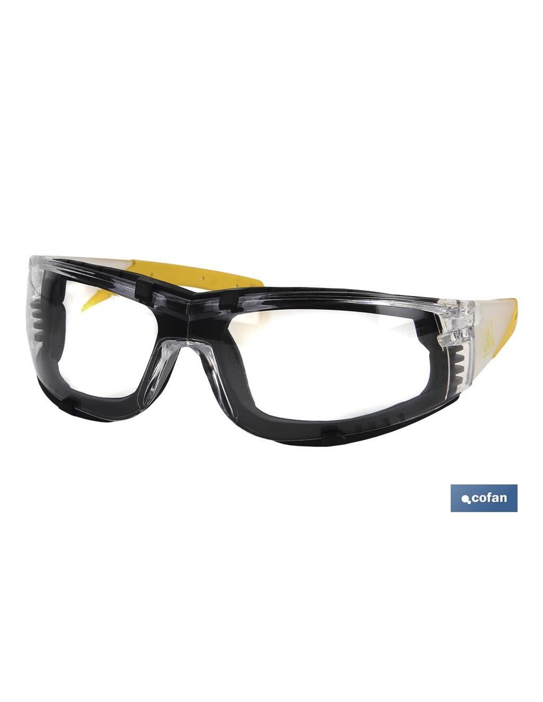 Padded Safety Glasses. They are designed to protect against high-velocity, low-energy particle impacts and extreme temperatures. Made of polycarbonate, TPR and EVA rubber. Yellow temples, very comfortable and safe. PPE CAT.II under specific standard EN166:2001