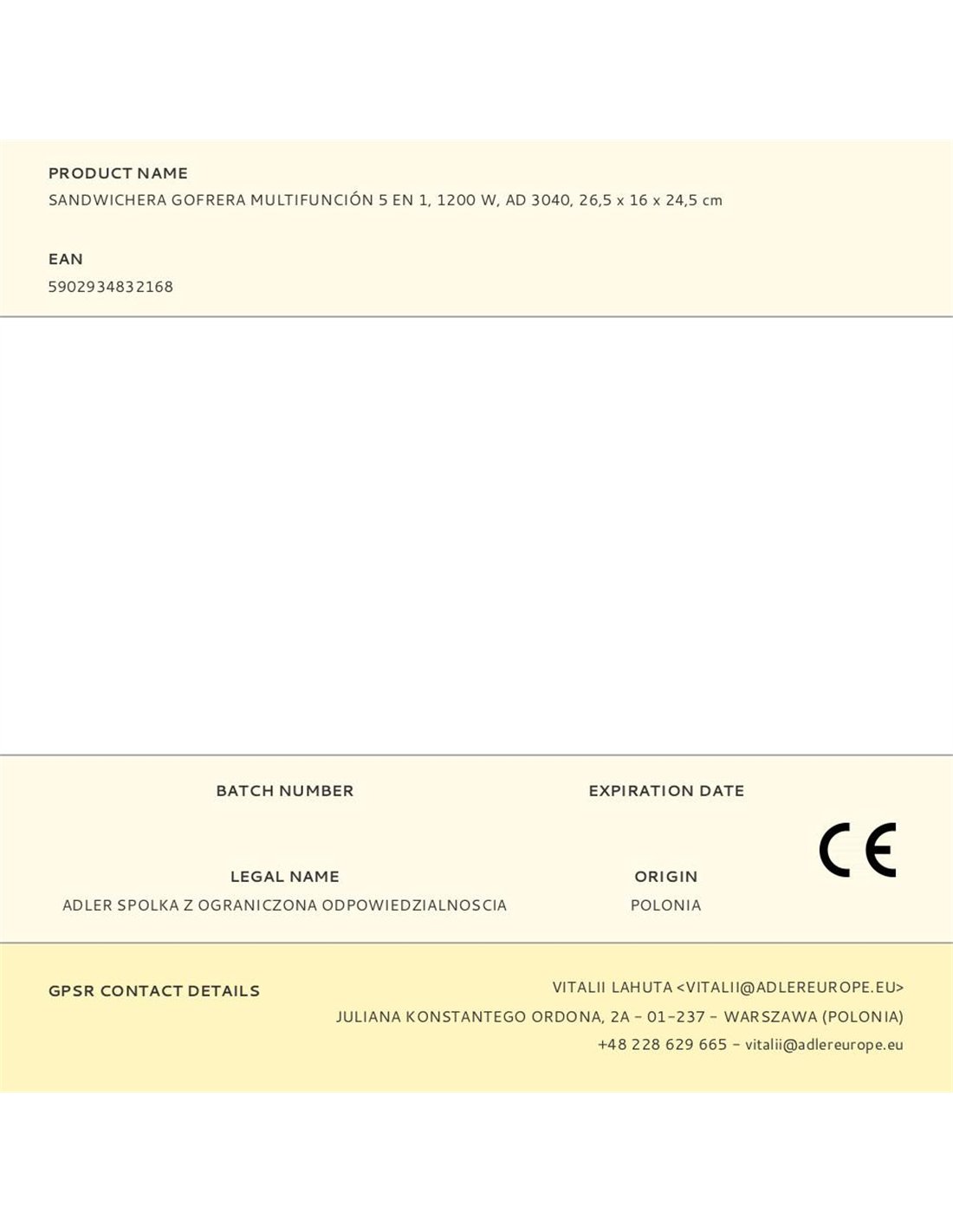 The AD 3040 5-in-1 Multifunction Sandwich Maker is a versatile appliance that combines functionality and design in a single unit. With a maximum power of 1200 W, this sandwich maker includes five interchangeable non-stick steel plates that allow you to prepare a variety of foods: from toasted triangular and square sandwiches to waffles, contact grills, and walnut-shaped molds. Its compact design (26.5 x 16 x 24.5 cm) makes it ideal for any kitchen, while its heat-insulated handles ensure safe handling. It also features two indicator lights that show when it is on and heating up, as well as non-slip rubber feet that provide stability during use. The sandwich maker also incorporates a simple plate locking system and overheat protection, ensuring safe and efficient operation.