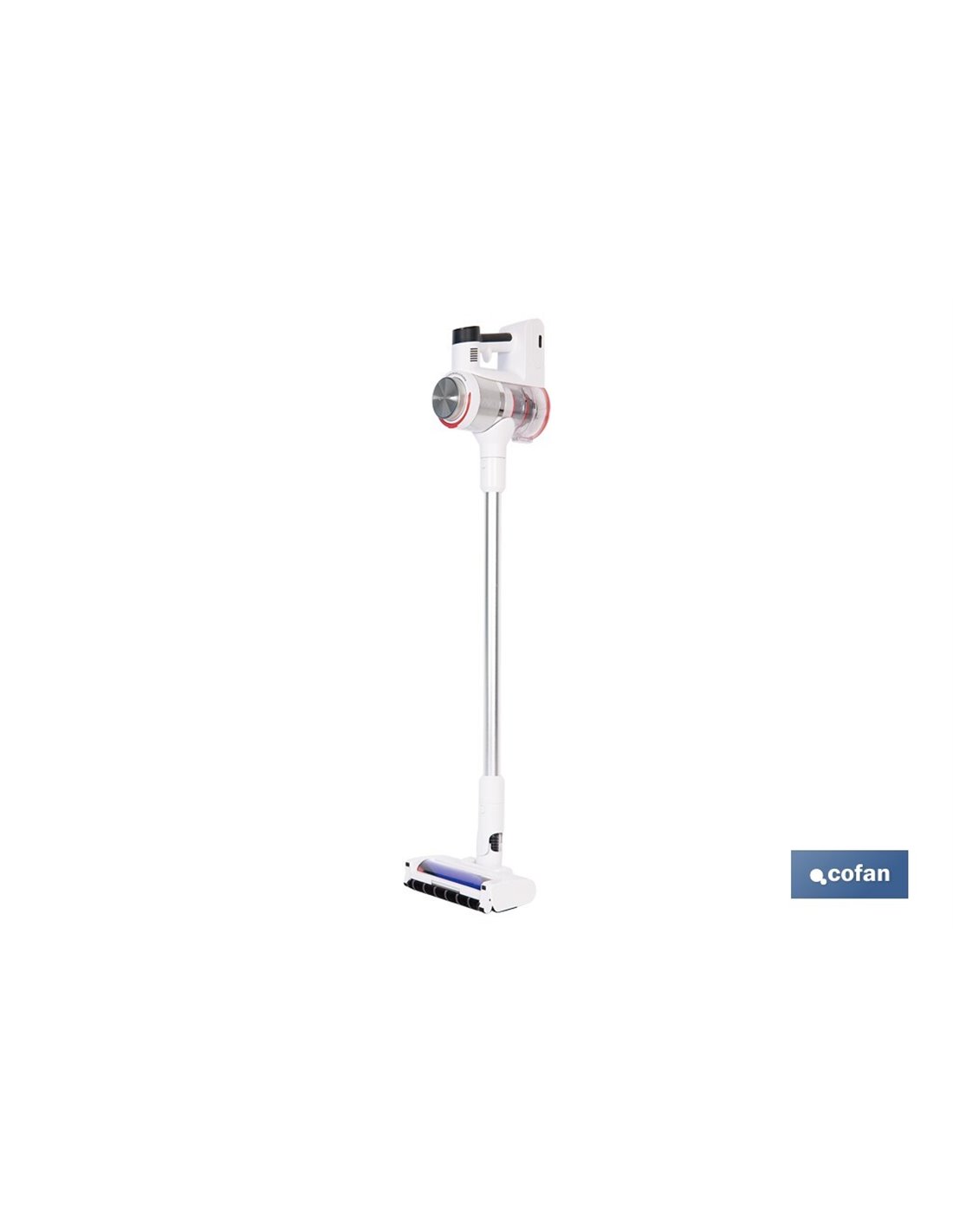 The white cordless wall-mounted vacuum cleaner is a powerful cleaning tool with a high-performance motor. With 180 AW of suction power and 32 kPa of pressure, it effectively removes dust, pet hair, and crumbs. 25.9V, 2500mAh lithium battery for up to 45 minutes of operation.