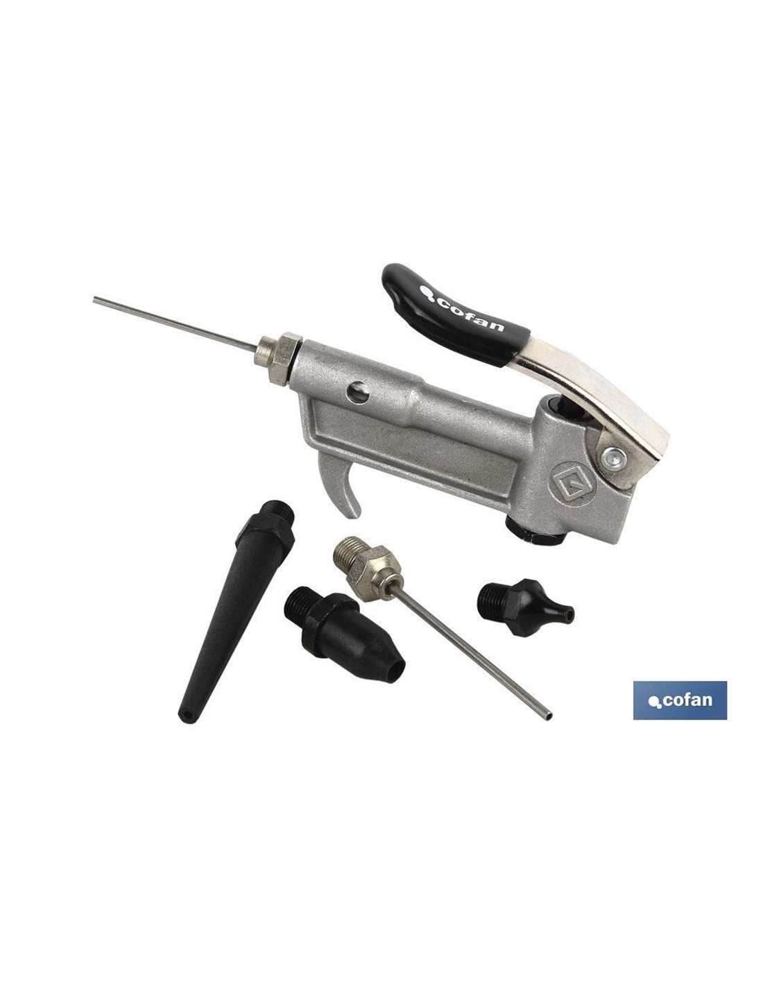 MINI SOFFIATORE AD ALTE PRESTAZIONI + 5 ACCESSORI (ago di soffiaggio corto, ago di soffiaggio lungo, prolunga, adattatore di soffiaggio 2 pz). Pressione massima: 2 bar-30 PSI. Alluminio. Filettatura 1/4"