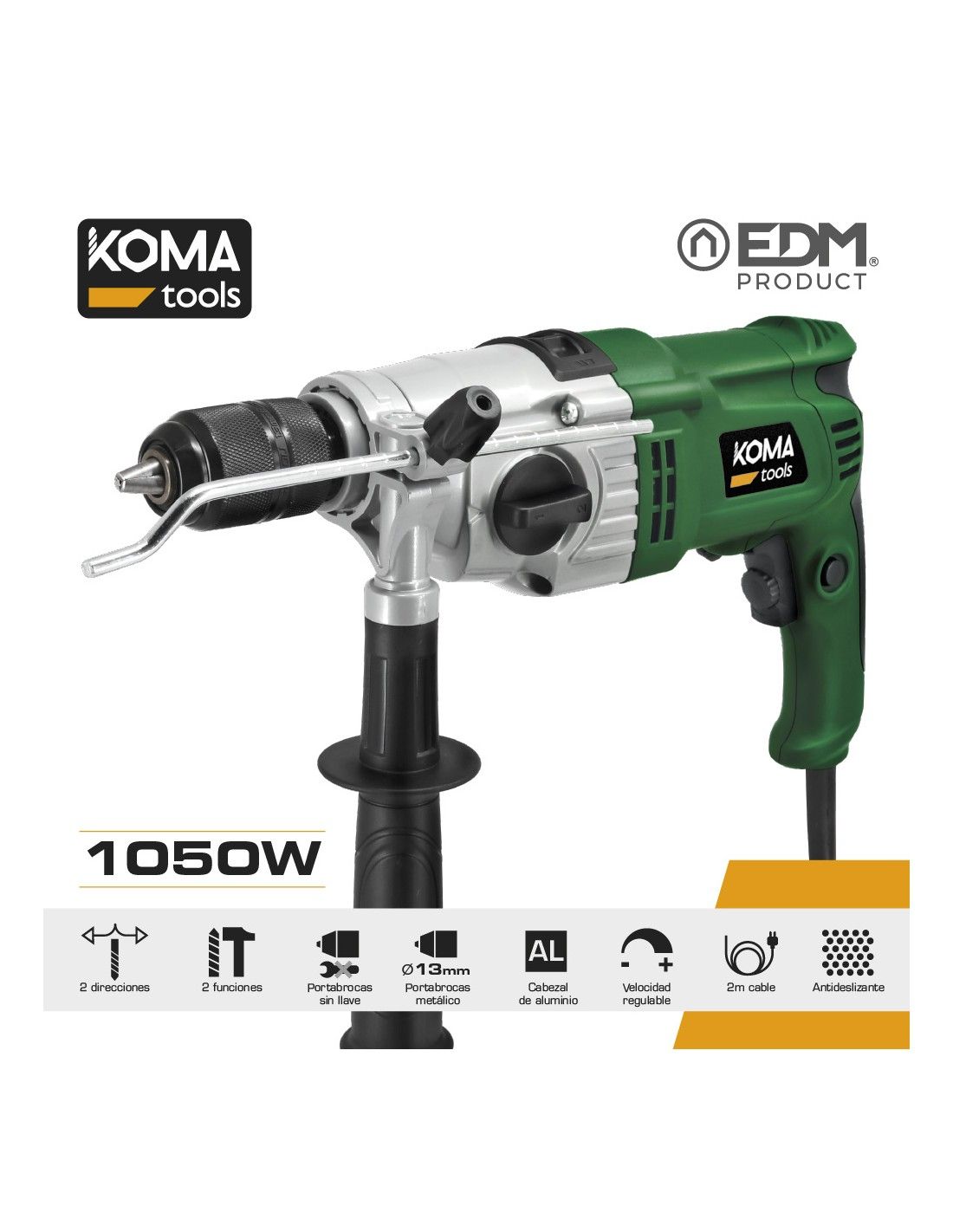 TALADRO PERCUTOR 1050W KOMA TOOLS. CON CONTROL DE POTENCIA, PORTABROCAS AUTOMATICO DE Ø 13mm, MANGO ERGONOMICO DE TACTO SUAVE, M