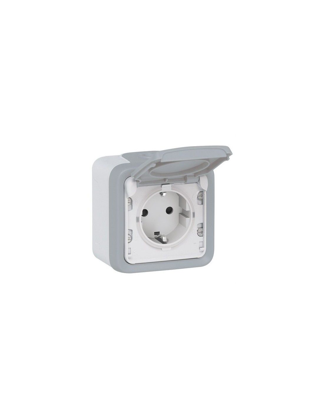 Meccanismo PLEXO MBLOC superiore 2 poli + terra. Prese di corrente - Grigio - 16 A - 250 V~~ - 2P+T con contatto di terra laterale - Morsetti automatici. Plexo - Meccanismi stagni IP 55 - monoblocco - da parete - prese di corrente - Fornito completo di 2 coni - piastra senza raccordo.