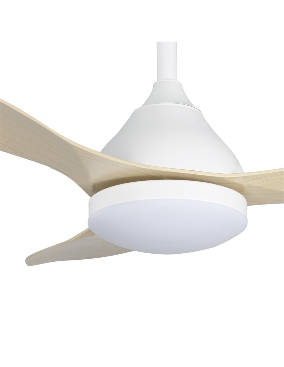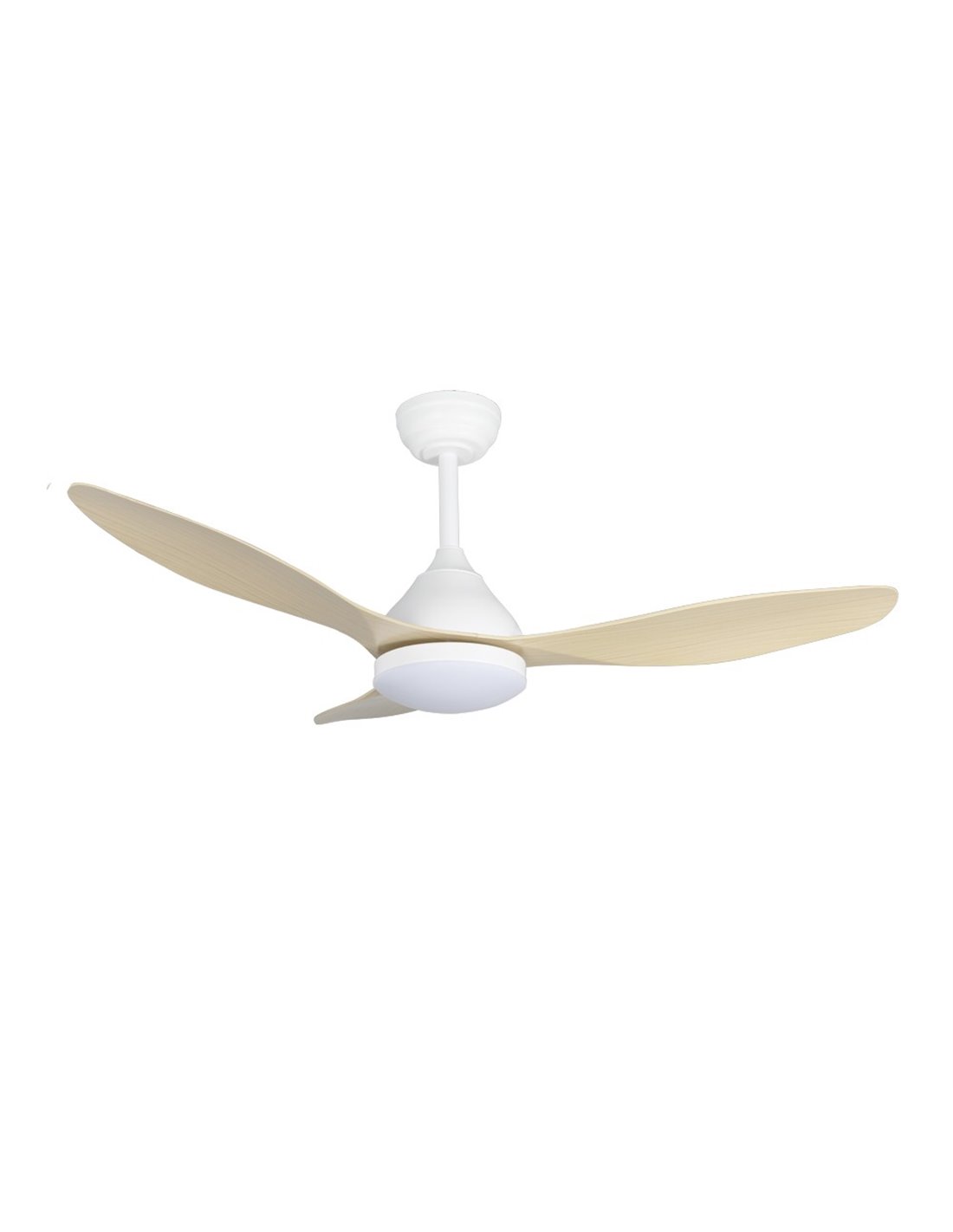 Ventilatore da soffitto silenzioso in stile nordico. Illuminazione LED integrata regolabile in intensità e temperatura colore. Dotato di un motore DC silenzioso, funziona con 6 diverse velocità e include un timer da 2h, 4h e 8h e una funzione estate-inverno. Memoria di accensione con l'ultima configurazione di illuminazione. Include telecomando per controllare la ventola e l'illuminazione. Motore bianco e pale in ABS color legno chiaro.