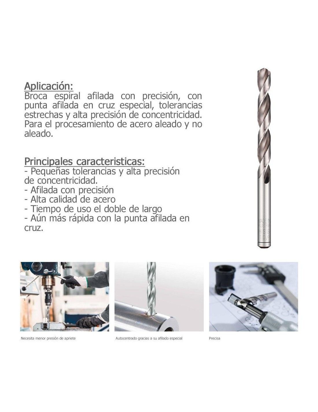 - Aplicação: Broca espiral retificada de precisão, com ponta especial em cruz afiada, tolerâncias estreitas e alta precisão de concentricidade. Para processar ligas e aços não ligados.