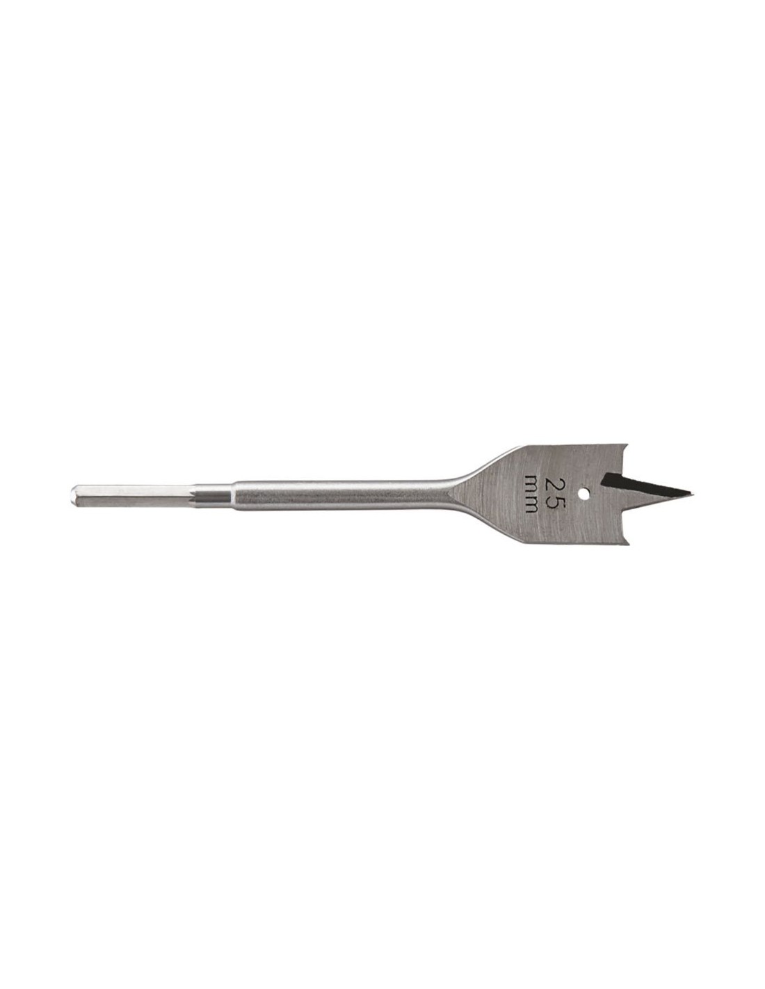 Broca tipo pá com 25,00 mm de diâmetro e haste sextavada de 6,35 mm, feita de aço temperado para ferramentas. Sua geometria plana e arestas de corte retificadas garantem cortes precisos e eficientes em diversos materiais. Com 152 mm de comprimento, é ideal para furos profundos e limpos em madeira, plástico e outros materiais macios. Perfeita para carpintaria, bricolagem e construção civil.