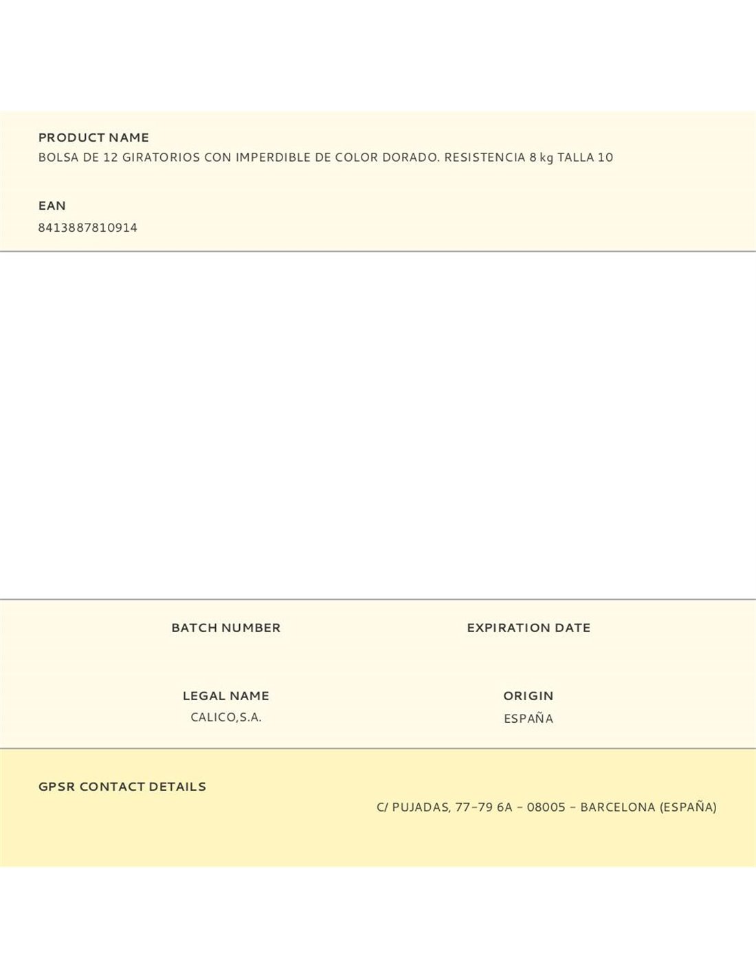 Saco com 12 alfinetes de segurança giratórios dourados. Capacidade de 8 kg. Tamanho 10.